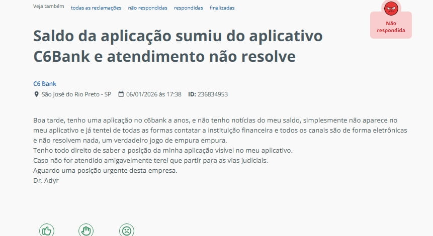 A idosa relata ainda que o atendimento do banco é feito exclusivamente por robôs, sem acesso a um atendente humano, o que agrava sua situação de vulnerabilidade, não existe acessibilidade e apoio ao idoso como rege o estatuto do idoso. O Estatuto do Idoso é a Lei nº 10.741, de 1º de outubro de 2003, atualizada pela Lei nº 14.423/2022, que garante e regulamenta os direitos das pessoas com idade igual ou superior a 60 anos no Brasil. A quantidade de reclamações diárias sobre sumiço de dinheiro relacionadas ao C6 Bank apenas no ReclameAqui já demanda uma apuração e cuidados das autoridades.