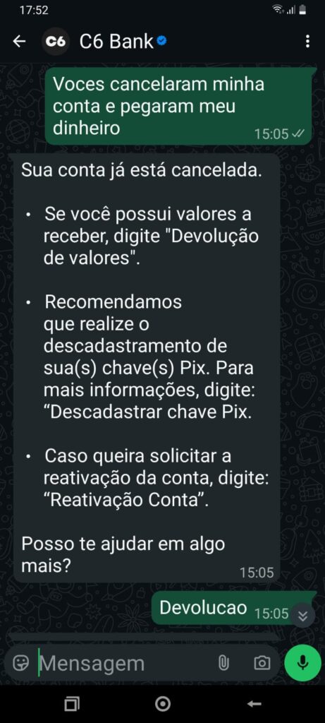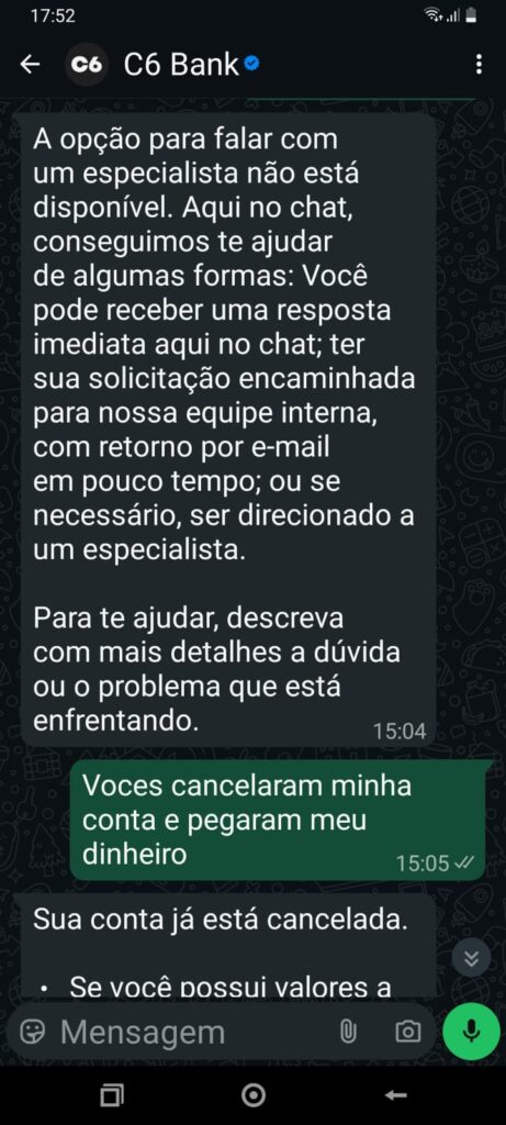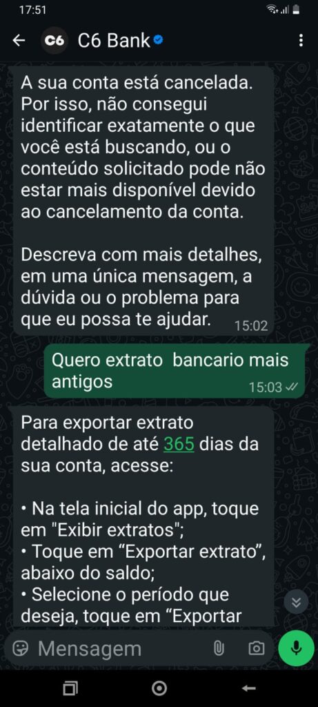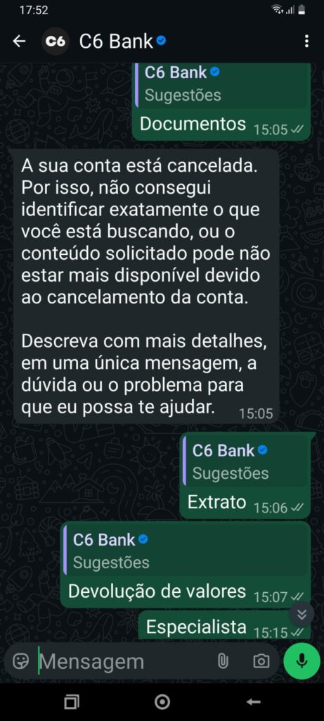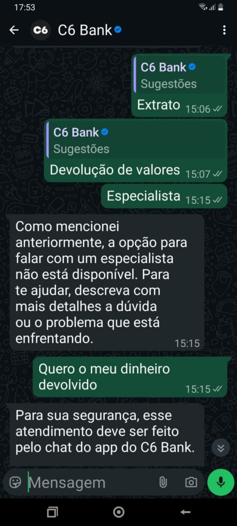 Nossa reportagem também testou o atendimento por whatsapp do C6 Bank e ele fica em looping e não atende o cliente, no sentido de resolver o problema. O call center é feito sem resolver o problema apenas fala ao cliente que no prazo entre 6 e 12 dias dependendo do caso, vai receber uma resposta por e-mail. Os e-mails recebidos também parecem ser automatizados, não dão informação pedida pelo cliente, nem resolvem o problema.