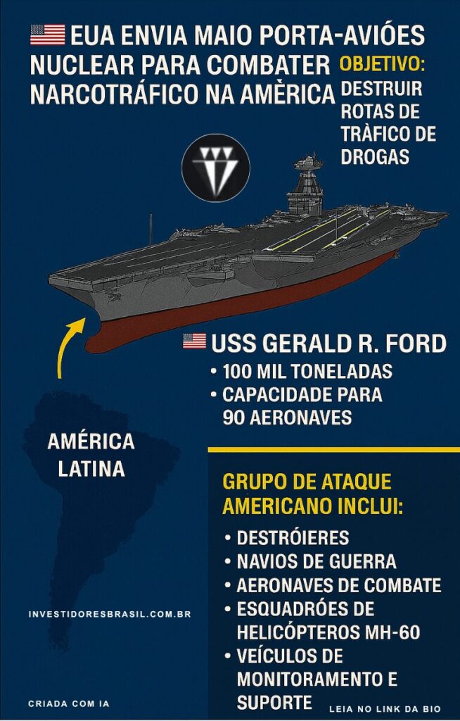 O governo dos Estados Unidos confirmou nesta sexta-feira 24 de outubro de 2025, o envio do seu maior e mais avançado porta-aviões nuclear, o USS Gerald R. Ford, para o Caribe. A operação, liderada pelo Comando Sul das Forças Armadas, tem como objetivo intensificar o combate ao narcotráfico internacional e aumentar a pressão sobre o regime de Nicolás Maduro na Venezuela.