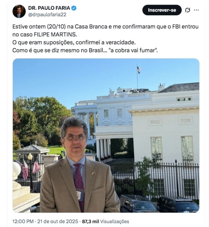– Estive ontem (20/10) na Casa Branca e me confirmaram que o FBI entrou no caso FILIPE MARTINS. O que eram suposições, confirmei a veracidade. Como é que se diz mesmo no Brasil… “a cobra vai fumar” – escreveu Faria, na rede social X.