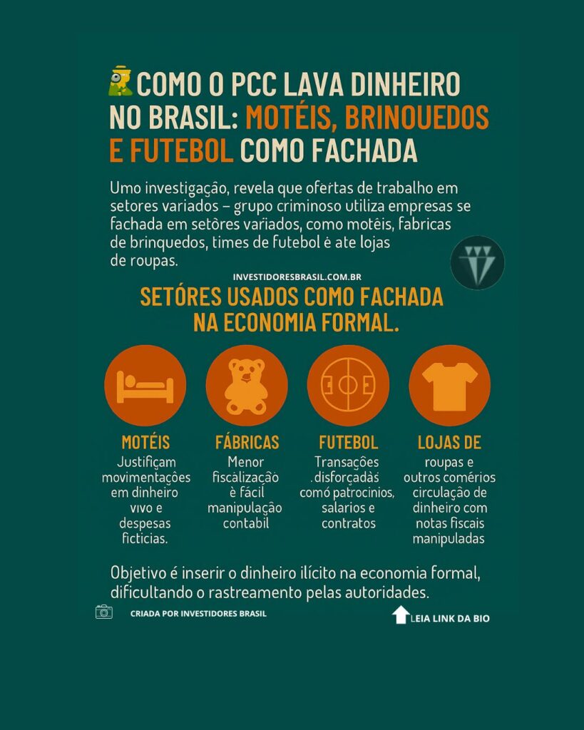 Uma investigação mostra que o Primeiro Comando da Capital (PCC) tem adotado métodos cada vez mais sofisticados para lavagem de dinheiro. O grupo criminoso utiliza empresas de fachada em setores variados — como motéis, fábricas de brinquedos, times de futebol e até lojas de roupas — para disfarçar o fluxo de recursos obtidos por meio do tráfico de drogas e outras atividades ilegais.
